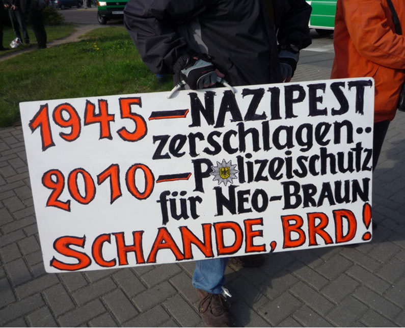 Hett sick datt allens lohnt, frööch ick mi? Bärer wier ein konsequent Verbot von allen Nazi-Organisationen dörch unsen Bundsdach in Berlin, denn Naziideologie ist keine Meinung, sünnern ein Verbrääken. Dei Naziverbräkers un ehr Regime sünd doch vör 65 Johren in Nürnberg verurteilt worrn. Bert Brecht hett 1955 vör denn Nazismus in sien Kriegsfibel warnt: Der Schoß ist fruchtbar noch, aus dem das kroch! Wo vääl €uros harrn wi spoorn künnt un sei bärer in Bildung un Uutbildung von Kinner un Jugendliche'n insetten süllt. Sei sünd doch dei grote Schatz von uns Gesellschaft!! |
