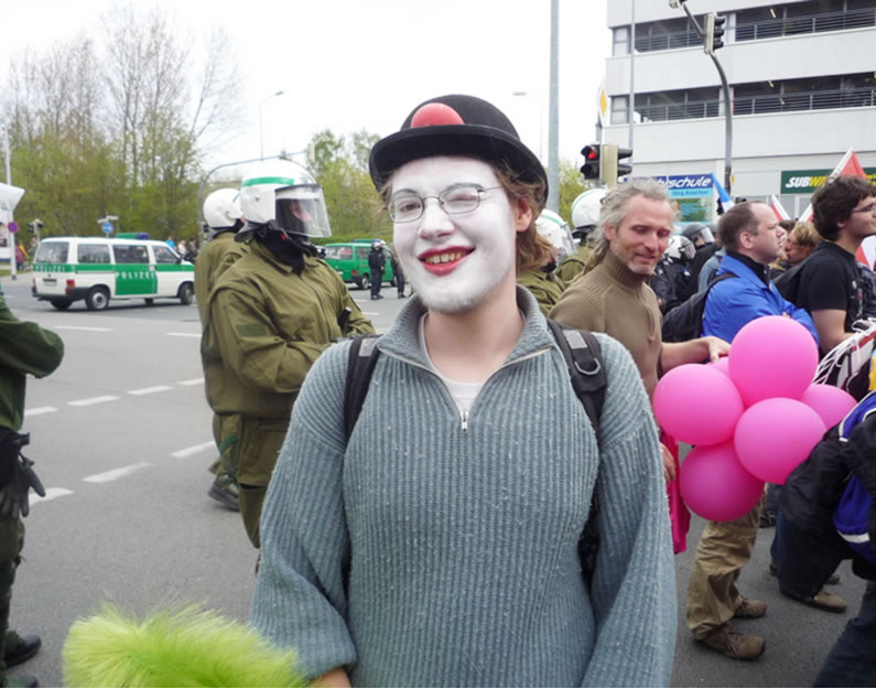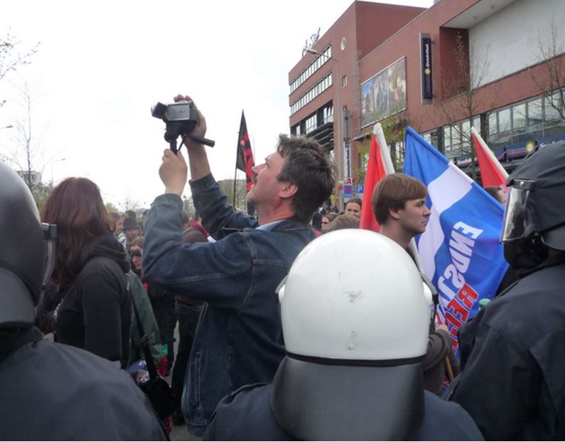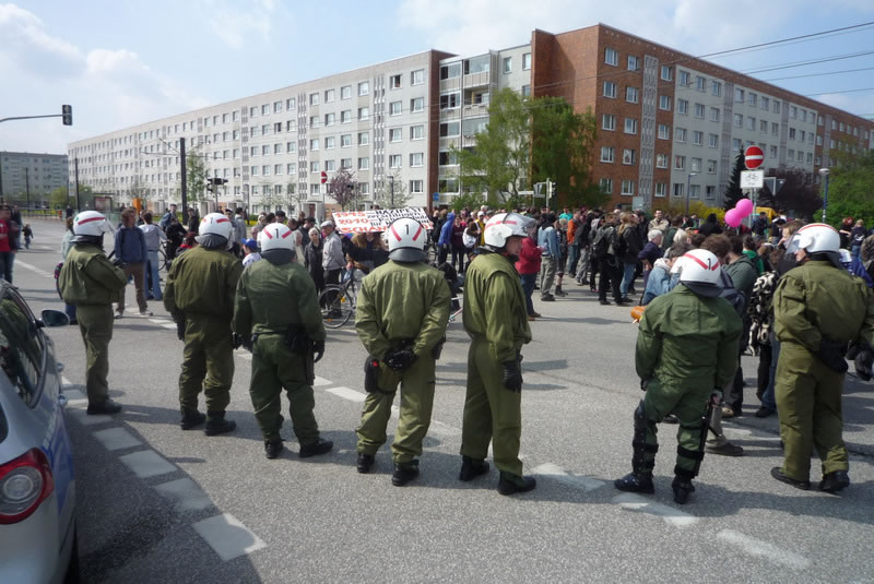 Upp keinen Fall wier dat so, datt is mien Meinung; ook dei wenigen ölleren Lütten Kleiner hinner denn Polizeikordon beööchten datt Geschehen taustimmend, doch sei reihten sick nich in denn Blockadblock in. Man kann ehr dat nich verdenken, denn dei oewer dusend Polizisten schreckten aww, un wer wüll sick in sien Öller noch mit dei Polizei anleggen. Doch wenn Dusende von Börgers kaamen wiern, harr sick dei Polizei bestimmt trüchhollen un harrn dei Demonstranten nich ümzingeln un inschüchtern koenen. Dei Kandidat vonne Linken, Helmut