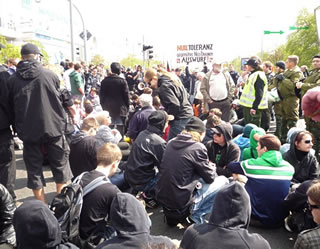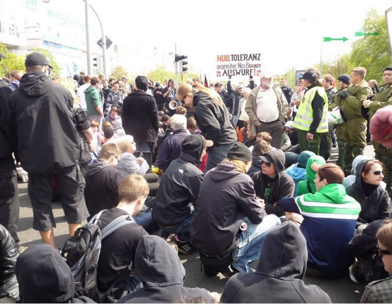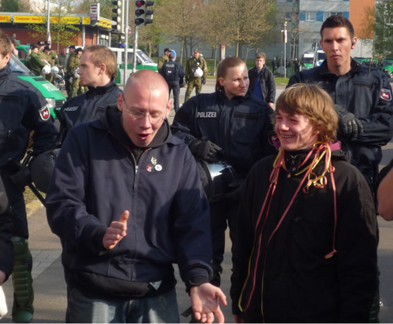 dat sick dei Jugendlichen nich provozieren laten süllen. Dei Instellung von dei Polizisten as so nöömte "Antifaschisten" wüür werrer düütlich in dei Stunn'von dei Blockad': Antifaschisten-Polizisten hinnerten dei Jugendlichen dörch ehr Blockadtaktik, dat sei ehre Meinung gegen denn Uppmarsch von dei Neo-Nazis taun Uutdruck bringen künnen. Ook Lietz hett einen dullen Patzer von sick gääben. Hei erinnerte an dei Gewaltlosigkeit vör 20 Johren, denn ook dormals wieren sei in Rostock gegen Panzer siegreich blääben. Luude Pfiffe folgten up dissen unwohren Vergliek. Wenn hei dormit denn Maut anerkennen wüll, harr hei sick bädere Wüürer infallen laten süllt. Heiko Lietz wier spärer nich miehr tau seihn, hei wier woll in't Fischerdörp gahn. Dei ehemalige Gesundheitsministerin, Dr. Marianne Linke (sei heit nich blots so, sei is ok vun de Linke Partei) oewer seih ick ümmer noch bi dei Jungen.
