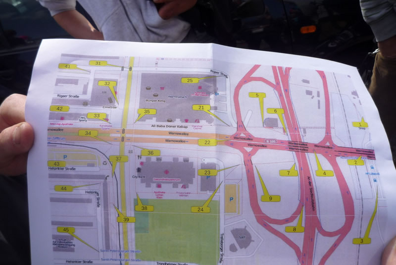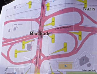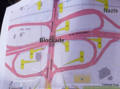 Dei Nazis harrn ehrn Plan wägen disse oewertüüchten Linken woll ännern möten orrer von Anfang einen annern Wech nähmen wullt, üm nich tau verliern, denn gegen 13.30 Uhr wüür bekannt, datt sei von 10 Polizeiautos vörwech ganz anners as plaant oewer dei Oll Warnemünder Chaussee in Richt Groß Klein trecken dähn!