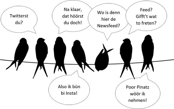 Nich uns Lüüd ståhn, sonnern unser "Team" orrer "Crew" steiht tau Deinsten. Besonners erfinnerisch sünd dei Horschnieder. Näben "Cut un Color" orrer "Color un Cut" för Schnieden un Farwen von Hor finnen wi Horschnieder, dei sik "Haircutter" näumen un dei Kundschaft mit 'n "Buzzcut" as Modeschnitt anlocken willen. Warüm kann dat nich heiten "Stoppelschnitt is wedder in Mod" orrer "Bi uns gifft dat den besten Stoppelschnitt för Manns- un Frugenslüd"! wer as dei Ollen dat blot von dei Nåht in'n Siedenstrupp secht hemm', dat dat dei inglisch Mod' is, wenn's nich gråd wer dei Wåden güng, so weit 'n hüt männigmål nich mihr: is man noch in Düütschland orrer doch all in Ingland?