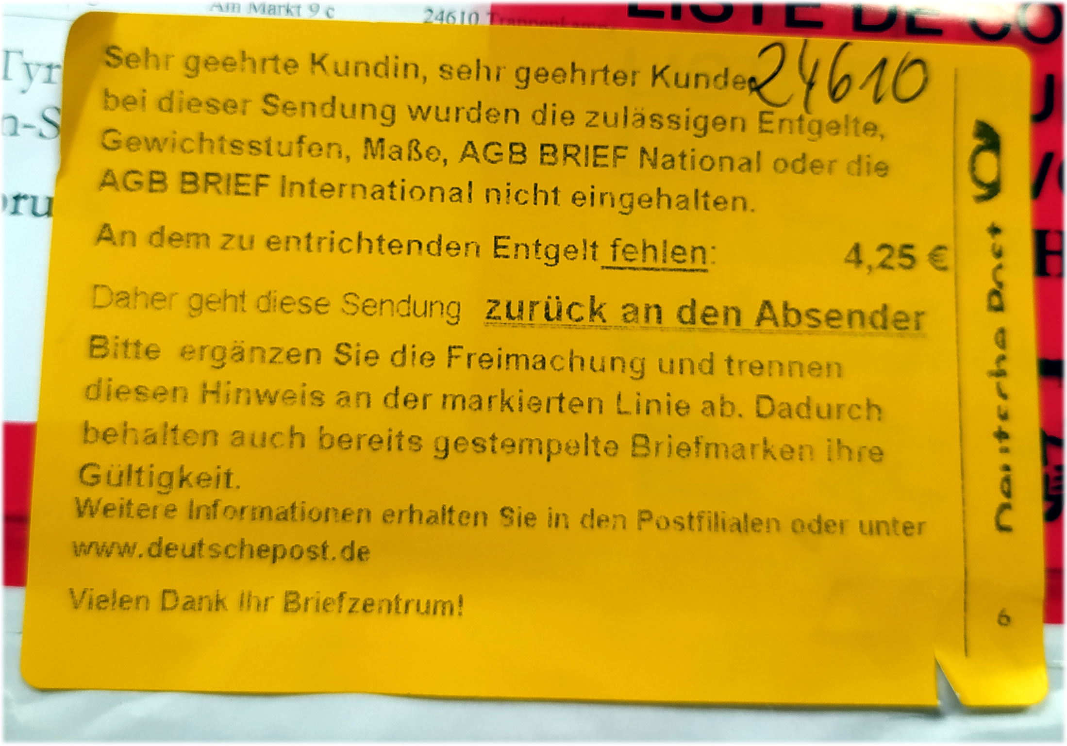 Wat? 200 Sendungen per Johr schall ik in't Butenland verschicken? Nixda! Ik kann also gorkeen Breefmarke mehr online betahln un utdrucken. Prima. Fortschritt. Dor woor mi dat to bunt. Woso schull ik mi hier en Been utrieten?! Ik heff dat eenfach so frankeert as de annern Bökersennen an den Dag un in'n Breefkassen smeten. Villicht kriggt dat ja nüms mit, un dat bummelt so stiekum na Öösterriek! Puustekoken. Dat Book keem torüch mit düssen Opbacker: Nu heff ik endgüllig kapituleert, bün na'n Postkiosk un heff dat tosättliche Porto köfft. Winst maak ik mit dat Book denn nich mehr ik harr dat ganze Porto nich vörweg op de Reken schreven. Harr ik dat daan, harr de Bökerladen dormit Minus maakt. Nu överlegg ik mi, wat ik en annern Breefdeenst utprobeern orr gor nich mehr in't Butenland levern schall. De Post op jeden Fall hett mi blangen ehrn Weg in den Foortschritt op de Streck liggen laten. 2.8.2022