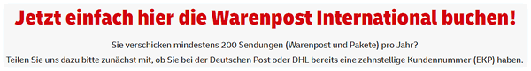 De Damens bi mien Postkiosk hebbt so'n plietschen Drucker, mit den se all Marken drucken köönt, avers nich de Marken för'n Book na Öösterriek. Snaaksch. Söben Euro sünstwat schall dat kosten, wenn een dat eenfach so schickt. Also dor is de Marke för'n Book doch billiger, meen ik mi to erinnern! Nu weer dat betherto keen Problem. Dor kunnst online gahn un di bi dhl.de en Marke drucken. Natüürlich bruukst dorto en Benutzerkonto mit all Schikanen dat kennt wi ja. Dat harr ik mi ok anleggt för de poor Maal, de ik dat betherto bruukt heff. Ik gah dor wedder hen. Man wat is nu?! De Siet, 'neem een de Marke drucken kann, is dichtmaakt de Post hett sik dorför ganz wat Niegs un Schickes utfunnen: Warenpost International. Niege Kundennummer beantragen, niege Daten ingeven okay... avers wat steiht dor?!