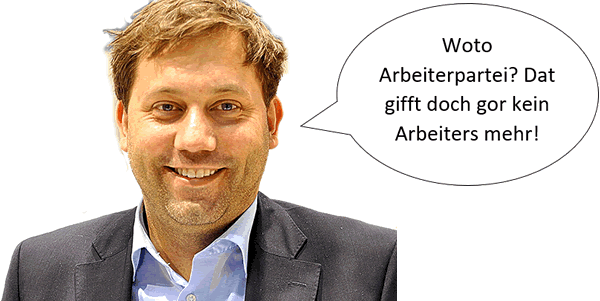 Up den Wech nå båben hemm' dei Sozialdemokraten un ehr Koalitschonspartner mit Gennern, Rägenbågen, Sexismus, Feminismus, Wokeness, Willkåmenskultur, Russenhass, Rüstung, Börgergeld un Kinnergrundsäkerung un anner Märken nich dei nödige Läus (Fahrspur) funnen un so dat praktiziert, wat Lenin all 1904 vonn russ'sche Sozialdemokratie säd: "Ein Schritt nå vörn un twei taurüch". Villicht höllt sik Lars Klingbeil för so'n Oort Lenin, hett hei dat doch schafft, SPD-Baas, Vizekanzler un Finanzminister in ein Person tau sien, ok wenn man blot 64,9 Purzent vonne Delegierten up 'n letzten Parteidach för em stimmten, wull ok ut den Grund, dat hei sik so schäwig gägenwer Saskia Eskens verhollen hett. Un denn: Dei Verspräken, dei hei in'n Koalitschonsverdrach uthannelt hett, warden up eins nich inhollen dei Minnestlohn kümmt nich as verspråken, mit den Strompries un dat Börgergeld is dat nich anners, för dei Rüstung is Geld dor, för Schaulen un Ollenhüs nich. Un dei Wirtschaft finanziert hei up Pump, denn bet 2027 löppt dei düütsche Schullenbarch up 850 Milljarden an. Un so willen s' wedder 'n Arbeiderpartei warden?