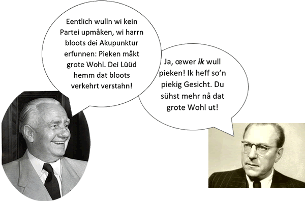 den dei hütig SPD för ehr Geburtsstunn' höllt. Man verhålt sik, weit wer ümmer nich so ganz genau, wat un wohen man as Midde-links-Partei mit Marx sien Gedankengaut stüern will, un denn kümmt dei Rosenmånd (Juni) 1933 un dei NS-Regierung ünnersecht dei SPD jedwed politisch Akschonen un brandmarkt sei as "staatsfiendlich". (Ja, uns' SPD, dei hüüt in Düütschland as dei staatsdragen Partei överhaupt gellt un dei jüst wedder sik sülven gägen ehrn Willen un sogor gägen ehr Intress in dei Plicht nahmen hett, mit Merz en Regeern tau billen, bloots dat sei den Staat vör dei AfD reddt. Na good, in den Sinn gägen Nazis sünd se wirklich fiendlich.) Nå'n Maimånd 1945 kümmt Discher Willem Pieck (Kommunist, 1876-1960) för'n Nieanfang ut't Exil in Paris un Moskau inne sowjetisch Besatzungszoon taurüch un deit sik dor mit Baukdrucker un Koopmann Otto Grotewohl (Sozialist, 1894-1964) tausåmen, dei mihrmåls vonne Nazis achter Trallen bröcht wür. Pieck sorcht för'n Nieanfang vonne KPD, Grotewohl för'n Nieanfang vonne SPD un up Drängen von Stalin, so ward vertellt, beschluten beid, sik tau verbünnen, un grünnen denn an'n 21./22. Prilmånd 1946 dei SED mit dei twei Vörsidder Pieck un Grotewohl anne Spitz. Pieck ward denn mit dei Grünnung vonne DDR dei ierste Präsident un Grotewohl dei ierste Ministerpräsident.