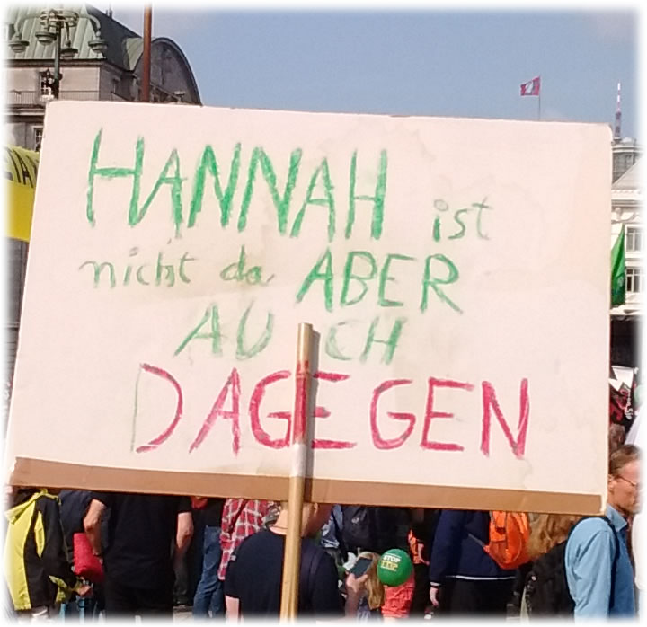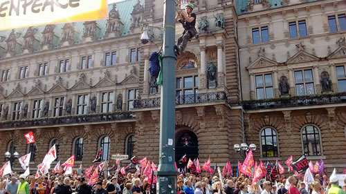 De Lü vun Greenpeace harrn ok wedder Klabasterers mitbröcht, de twüschen de Pieler direkt vör't Raadhus en groot Transparent anbröcht hebbt. De offizielle Verantwoortliche müss ehr pro forma mehrmalen över Luudspreker beropen un seggen, dat weer nich inplaant, se schulln nu rünnerkamen; man nix da, se hebbt seelenruhig wiedermaakt. Dat leet, as weer dat stillkens en Övereenkamen. Nüms hett wat dorgegen daan, ok de Udels nich, de de ganze Akschoon afsekert hebbt. Se harrn wiss ehrn Spaaß un weern in't Hart ok bi de Demonstranten.