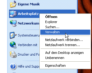 Start-Menü apen maken, den Arbeitsplatz rechtsklicken un Verwalten wählen.