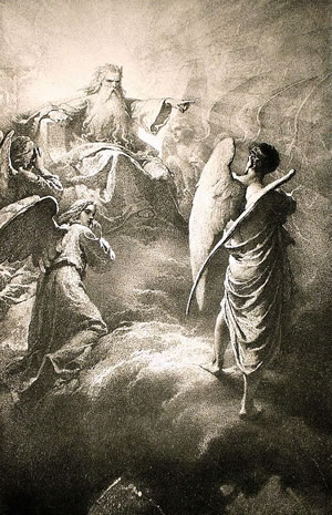 Von Bedüdung is noch, dat allens natüürlich na dei överleverten Geschichten Gott dei Engels måkt hett, as hei gor nich doran dacht harr, dei Ierd un all den annern Kråm tau måken. Un gråd in disse ierste Tiet hett sik dat all taudrågen, dat dei Engel Satanel nich Gott sien Wark sien wull; hei hett sik upbömt, un ein Drüddel von all dei Engels hemm sogor mitmåkt. Dat hett sik dei leiwe Gott wer nich lang mit ankäken un sei standepeh verdammt. Gott leet disse Engels fallen un sei würn as follen Engels inne Höll steckt. As Wäsen ute Höll sünds as Düwel, Satan, Luzifer un Belzebub bekannt un mierstendeils nich engelsbleik, sonnern pickenschwatt målt. Dorbi föllt mi n Beläwnis inn Kongo in. Dor wullen dei Schwatten nich inseihn, as Missionare sei vör Tieden tau Christen bekihren wullen, dat Engels so hübsch un witt sünd. För sei wiern dei Engels schwatt un dei Düwel witt! Un dat mach ok inlüchten; un so sall jederein wiederhen dei Schöpfungsgeschicht för sik so utleggen, as em dat geföllt.