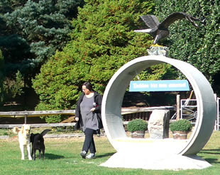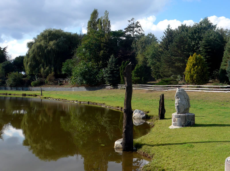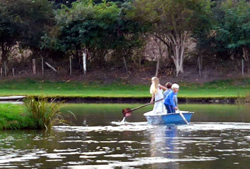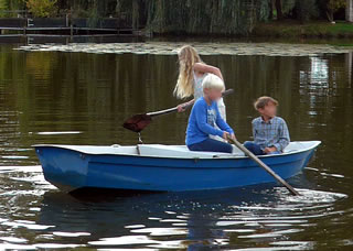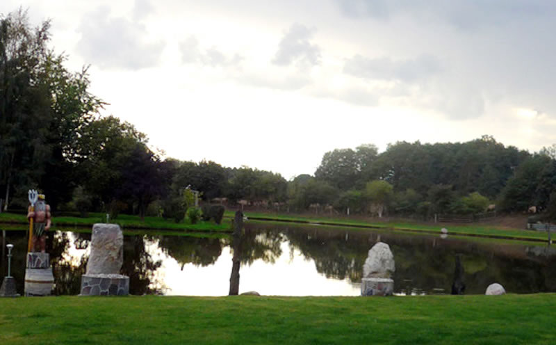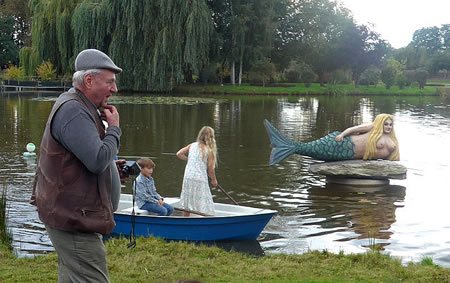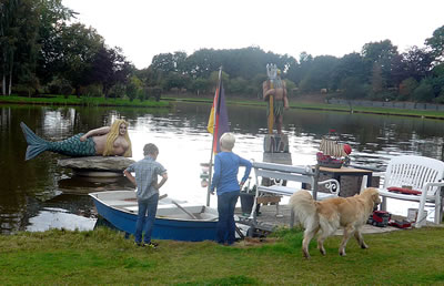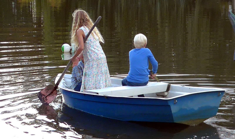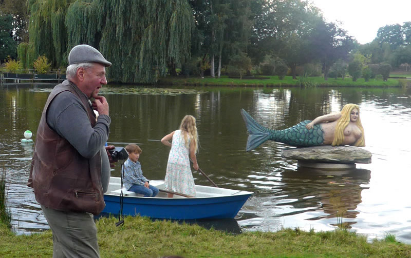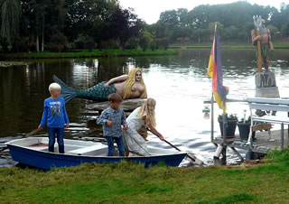 An de Nix Undine un den Watergeist Ekke Nekkepenn vörbi schippern se up den Diek. De Figuren weern vun Holt un stünnen in den Diek. Se sehgen de richtigen Geister bannig liek. N'beten bang keek Opa de Kinner achterna. De Diek weer immerhin meist 2 Meter deep. In't Water dörfen se nich fallen. De Watergeist Ekke Nekkepenn keek meist so'n beten grimmig to. He stütt sik up den Dreezack. Notfalls kunn he dormit to Hölp kamen. Undine leeg up en Boomstubben un keek to.