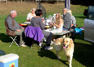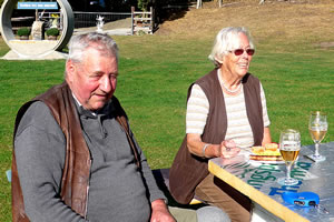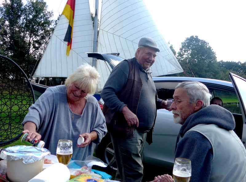 Harald begrööt uns ok un wünsch uns goden Appetit. Denn proost he uns mit sülvstmakten Appelsaft to. Wi leten uns dat goot smecken. Bi strahlenden Sünnenschien an den niegen Diek sull uns dat wohl goot gahn. Achterna geev dat noch en wunnerbore Appeltort, vun Frünnen backt. De Koken weer noch gor nich ganz afköhlt.