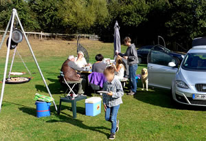 Up de Grillpann leeg al Fleesch un Wuss. En goden Ruuch steeg uns in de Nääs! De Hund Eik leeg ünner den Grill un pass up, dat dor keen an dat Fleesch güng (wenn he sülven dor schon nich ran dröff). De annern twee Hunnen begröten uns mit luud Gebell.