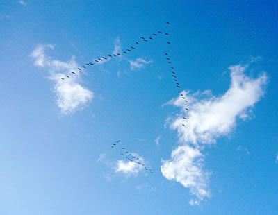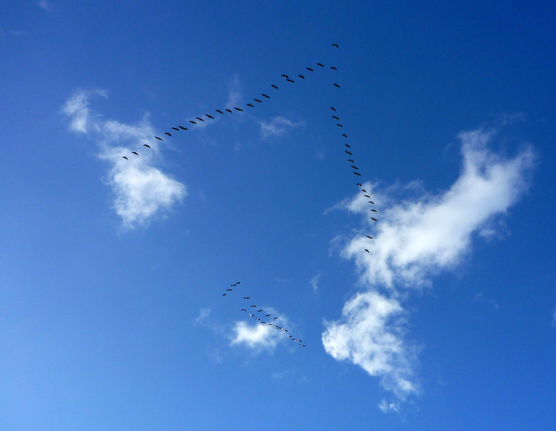Nu warden welk bi't Danzen sinniger. De een un annere Kraun staakt un stelzt mit siene langen Been in'n Kreis üm de danzen Vagels rüm. Un jümmer mehr sluten sik disse Polonääs an. Se nickköppen un fangen an to snacken, an to singen: Disse Musik, de as häsige Nevelhuurns un tostoppte Trumpeten klingt. De Danz geiht to Enn. Un unverwohrens ward dat still. De Kraunen fleigen up un verswinnen,