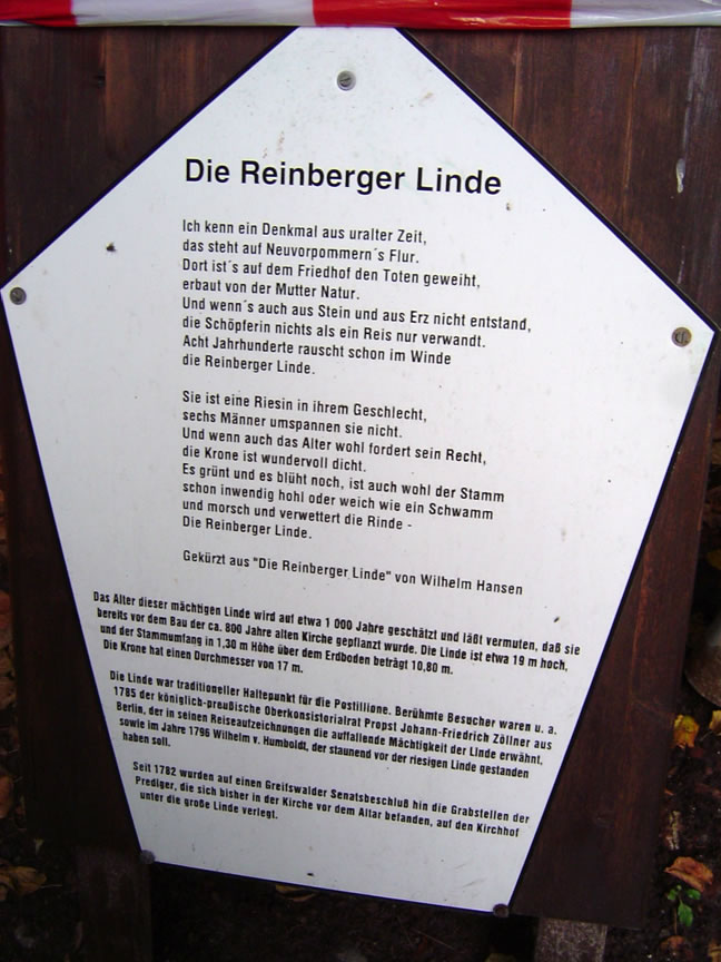 Doch wi fünnen disse urolt Linn, dei in'n Volksmund ok "dicke Linn" beteikend ward, ganz unverhofft bi ein Fohrt dörch Vörpommern up denn Friedhoff von Reinberg. Sei sall na ein Schild ein Öller von 1000 Johren hemm wat von Fachlüüd jedoch betwiefelt ward. Dei schätzen dat Öller up 500 - 800 Johr.