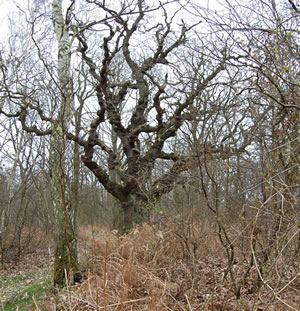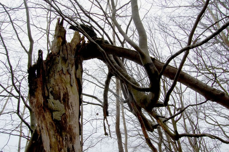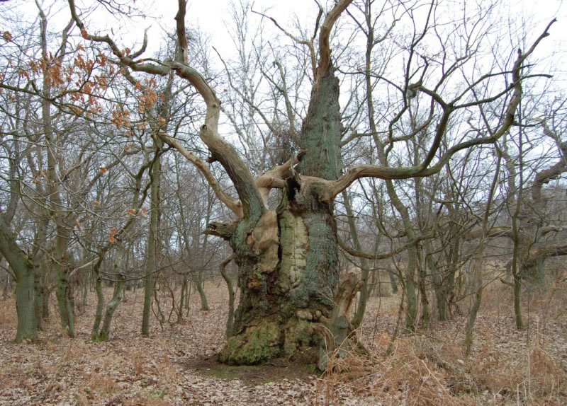 na baben. Eine olle knorrige Eik is von einen Blitzschlag so kaputtschlagen