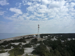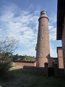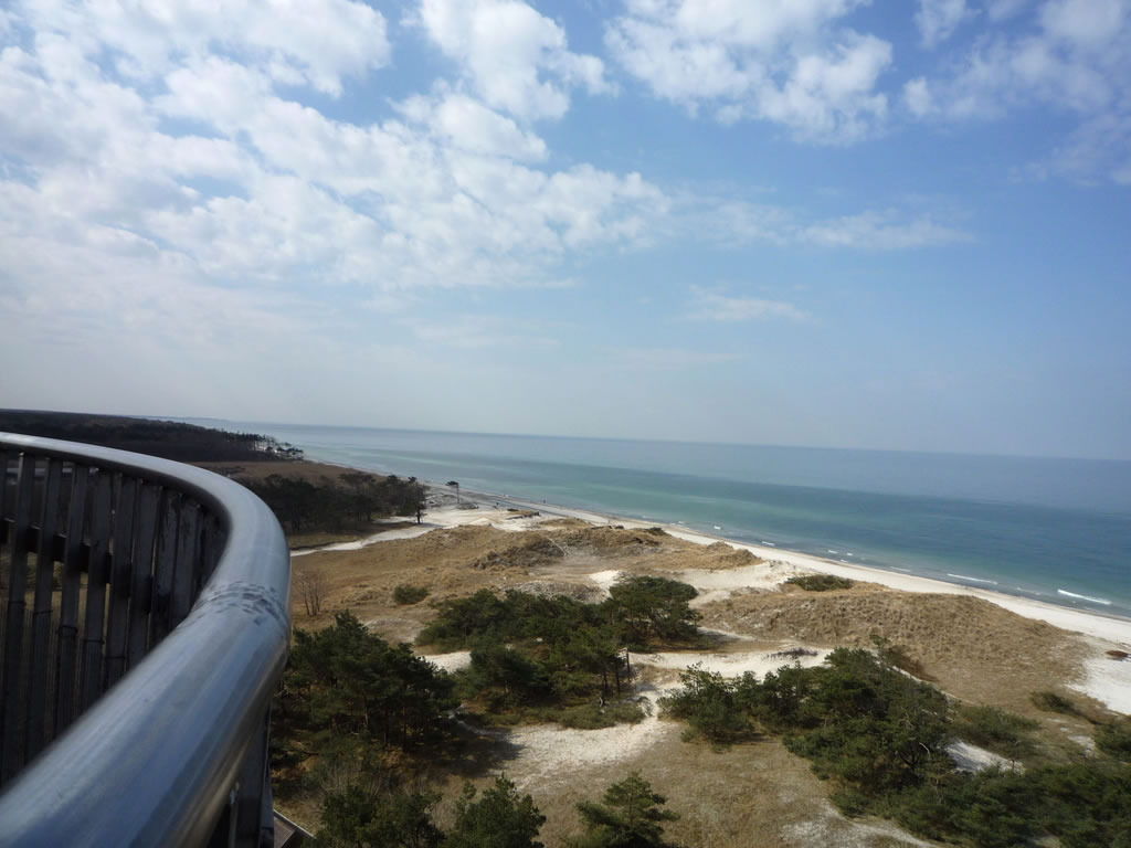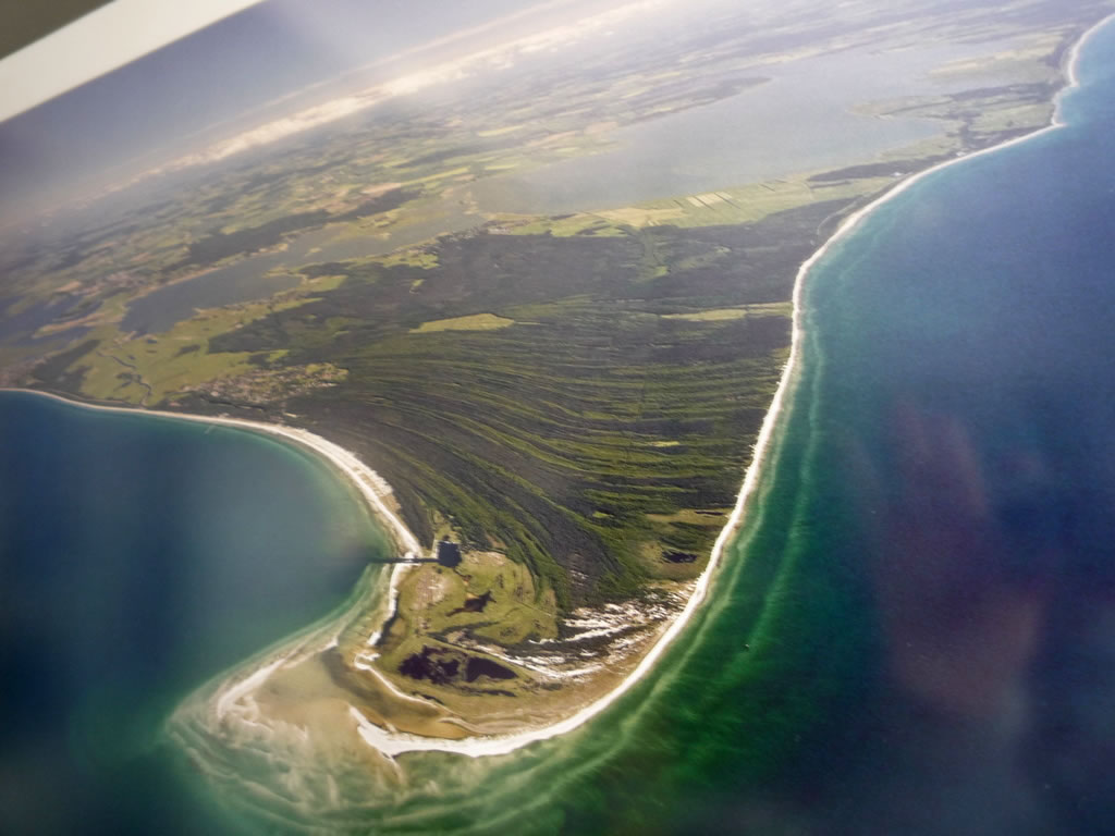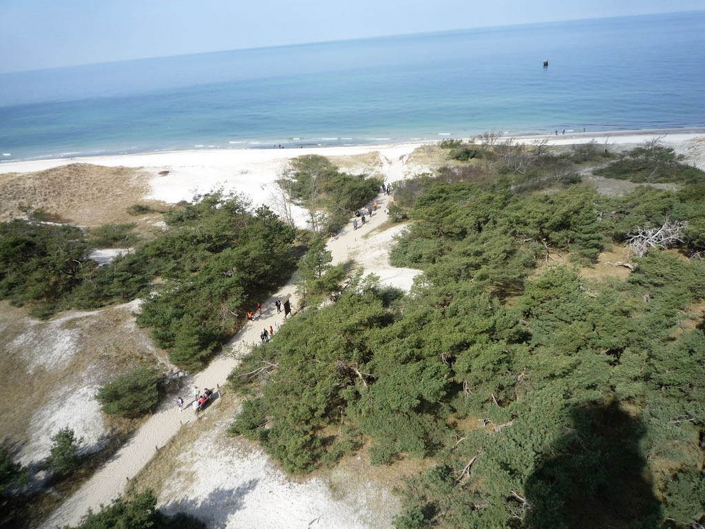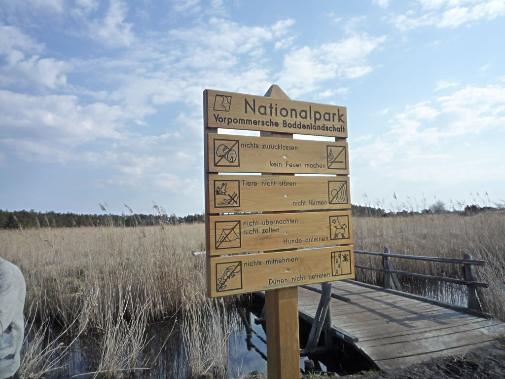 Stell di vör, dei is noch tau un dei Kraug ok. Doest un Hunger dörf man na dei Wannerung nich hemm'. Klock elben ward dat historische Buwark denn upmakt, oewer man möt binah 200 Stufen hochkladdern, wenn man dei interessante Boddenlandschaft von baben ut geneiten will un dei ollen Knaken sick vör dei Anstrengung nich schugen daun. Wecker denkt all doran, dat viellicht dei Wind den'n Sand von uns' Stolteraa in Warnemünd' bet na den'n Darß pusten un dormit tau 'ne "Inselniebildung" orrer tau einen niegen Haken bidrägen deit? Disse Landschaft is würklich schützenswiert, wiel sei einmalig is.