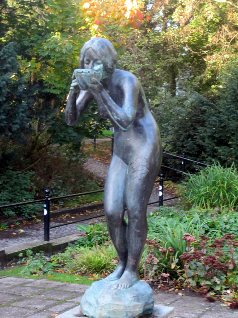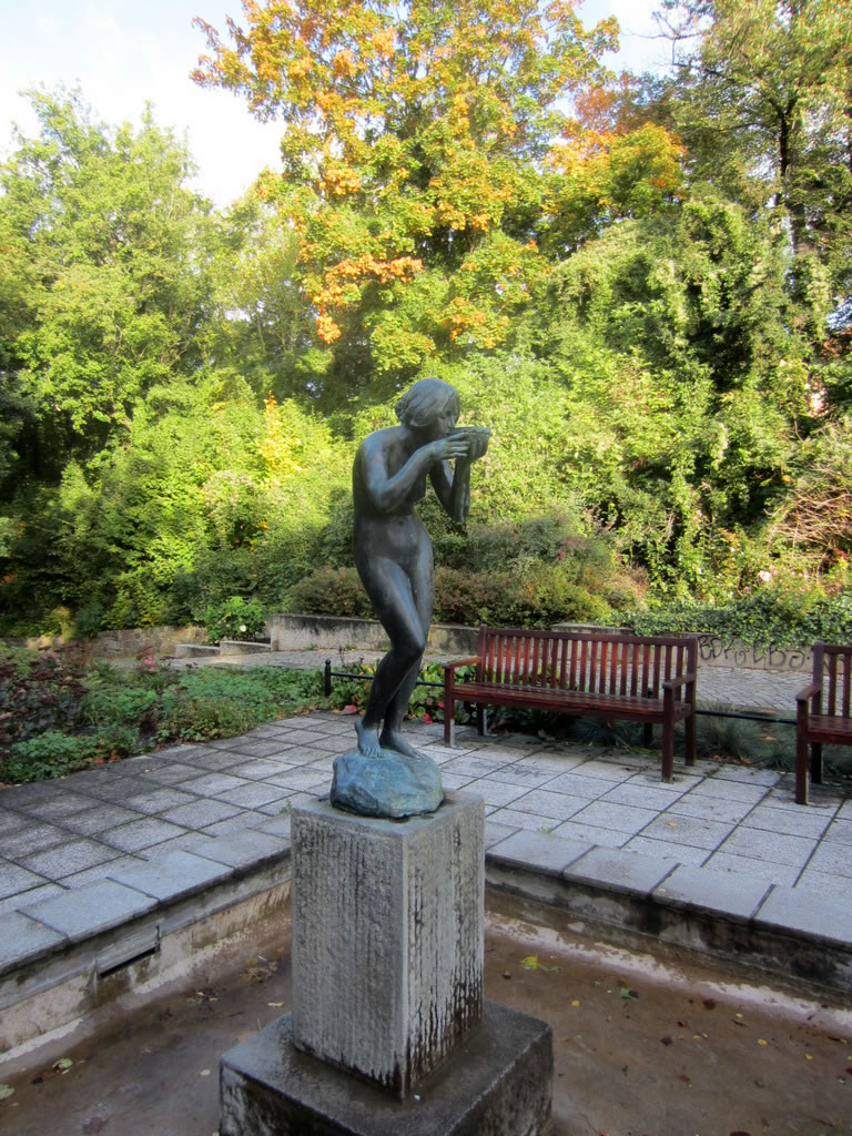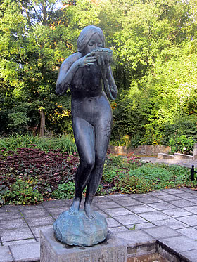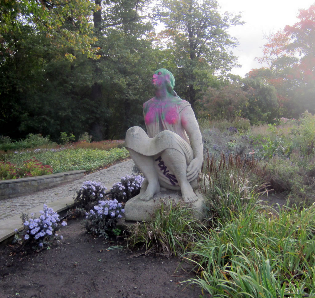 Doch dei farwbeschmeerte Frugensskulptur in dei schöne Blaumenrabatt'