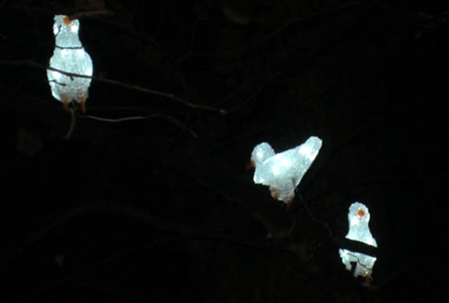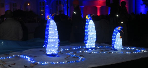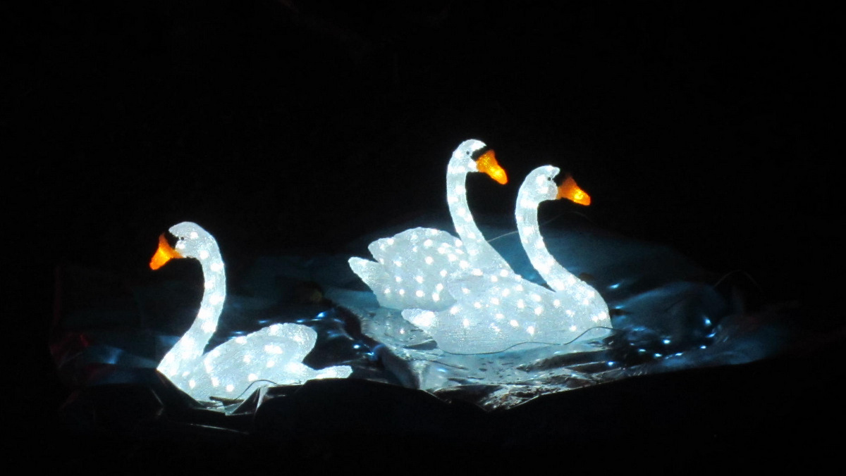 Ook dei Brunnen is nütt worrn un hett Waarergefleugel Platz gäben. Grote Lüchtblöck maaken de Plastiken ook inn Dunkeln sichtbor.