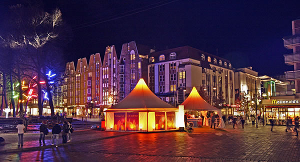 Ein einzich Farwenspääl rund üm denn Platz. Doch nich blots de Farwen beläwen denn Uniplatz, ook de "Kröpi"-Schauspälers, Gaucklers, Danzgruppen un Musik maaken de Abendstunn för Jung un Olt tau ein lustich Awwesslung.