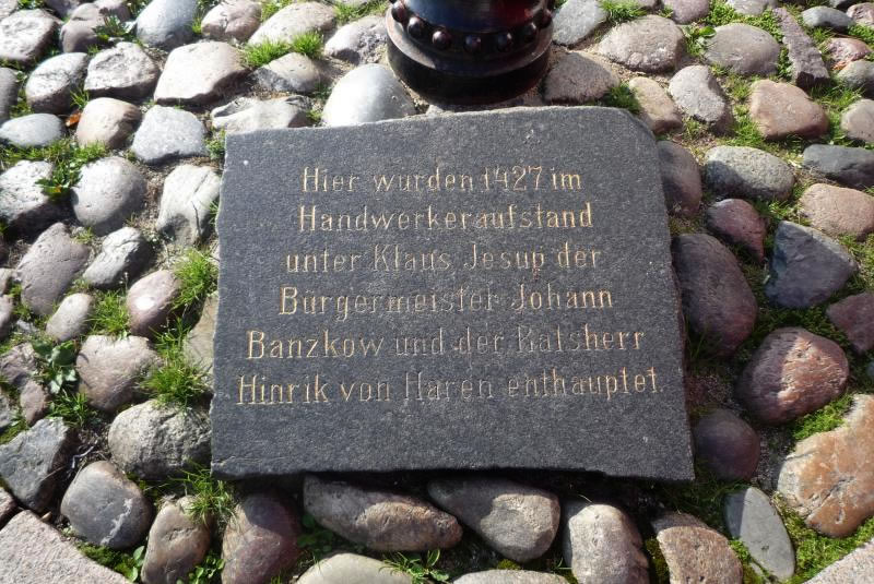 Dat Rathus, schön witt mit rode Geranien in de Blaumenkästen, süht ümmer inladend ut. Wiest dat up de Wismarer Farben hen? Hier hett de bekannte Burmeistersch, Fru Dr. Wilcken, väle Johrn residiert, dat Zepter schwungen un wat för ehre Stadt bewägt. De Bom mit de Bank, dicht bi de "Schwedenwache", steiht noch, un dor möt doch ok de Klaus-Jesup-Stein sien. Ja, hei is noch dor! Hei licht nu ünner eine hoge Latern', ein bäten höger as all de Stein up den'n Marktplatz. De Inschrift is gollen utmalt worden un wiest dorup hen, dat de Wullenwäwer Klaus Jesup den'n Burmeister Banzkow un den'n Ratsherrn, Hinrik von Haren, 1427 an disse Stell hinrichten löt. De ierste wull afhaugen, wiel hei gägen de Dänen verluren har, un de anner verschenkte de ganze Soltflott von Wismar an Dänemark.