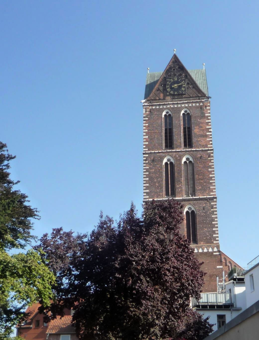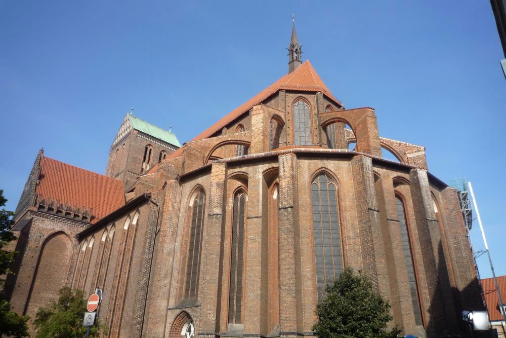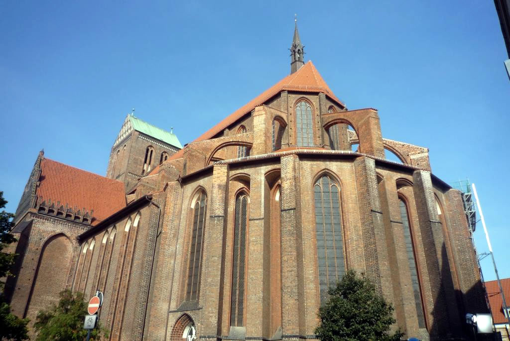 Deip beindruckt kiek ick an de mächtigen Säulen hoch, de kein End'n tau nähmen schienen. 37 m hoch sünd disse gewaltigen Standbein, de dat Krüzrippengewölv drägen möten un dat ok könen. Wenn ick mienen Kopp ganz wiet in den'n Nacken bögen dau, denn kann ick de middelöllerlichen Malerien ünner de Kirchendeck sogor erkennen, un von dor baben hängt eine lange Metallkett' runner, de einen wunnerschönen Lüchter fasthollen deit. Wenn ick bedenken dau, dat unse Marienkirch in Rostock binnen bloten 33 m hoch is, denn möt ick doch staunen. Hüt hett de Kirchturm ein Dack, in dat Middelöller wier dor ein Turm, höger as de Petrikirchturm in Rostock, oewer niedriger as de allerierste Rostocker Nikolaikirchturm. Hemm'n de Hansestäd sick gegensiedig utsteken wullt, üm so ehre Macht tau demonstrieren?