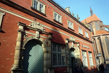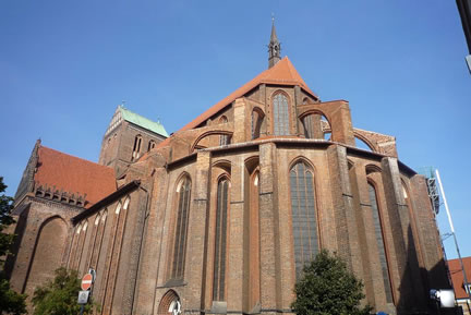 De vier lütten Bronzeschwien betrachten wi mit Vergnäugen, seihn, dat dat Schabbellhus noch saniert ward, un schmieten denn ein Og up de Nikolaikirch. Miteins hemm'n wi de Idee, uns' Fohrt mit de Backsteingotik tau verbinnen, un beträden disse grote Kirch.