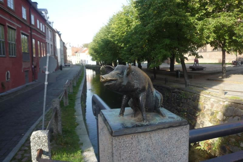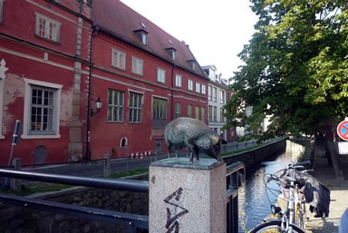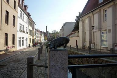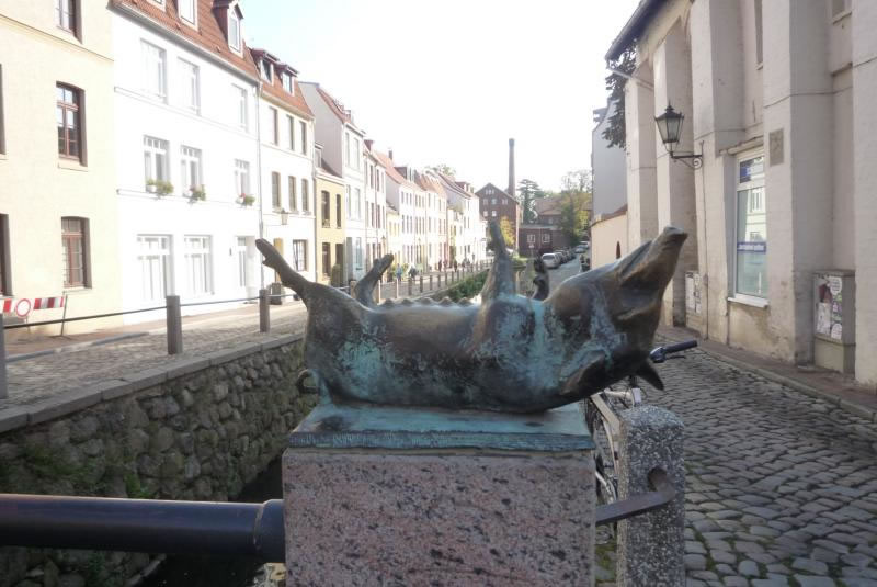 As wi ut de Bahnhoffshall up de Strat kamen, oewerföllt de Stadt uns gliek mit ehre Schönheit. Gradoewer, dor wo de Frische Grube is, seihn wi all restaurierte Hüser. An dissen Grab'n, de in de Ostsee fleiten deit, gahn wi denn lang bet na de Schwiensbrück.