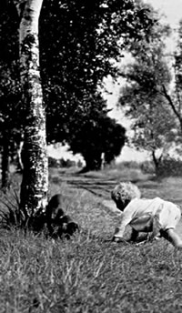In den iersten Sommer vun mien Leven güng dat jo noch för mien Mudder. Wenn se rutmüßt to de Feldarbeid, denn klemmte se sik den Wäschekorf mit mi dorbinnen ünnern Arm or stellte mi up de Schuufkoor. So tröcken wi to Feld. Se stellte mi in'n Schatten vun en groote Bark af. Dor harr ik veel över mi to bekieken. Mit teihn, ölven Maande avers weer mi dat Rümkrupen un