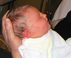 Denn avers harr hei mi. Dat mutt avers nich blots Mudder åsig tosett hebben, ik weer blaag anlopen un harr keen Lust, buten in de Welt denn eersten Japser to doon. Wat bleev den Dokter övrig. He faat mi an de lütten Been un sleuderte mi rümmer as in en Karussel, wieldat helpen schull.