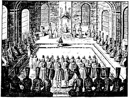 An'n 26. Mai 1634, as dat al 'n beten warmer worrn weer, kunn de Reis na Mokau in Planwagens wiedergahn. Na 'n anstrengen Fohrt dörch Schiet un Dreck, över knubberig Land un Wriedenholt weg, un na heel unruhige Nachten, in de jüm de Bremsen, Mücken un Miegreemen an't Fell wullen, kemen se na Kapura in't Ingermanland. Hier hebbt se in de ole Festung övernacht un harrn vör't eerst jüm ehr Roh vör dat Gedruus un de Stekeree. En poor Daag later langen se an en groot Landgoot an. Dat hör den Bojaren Basilowitz. Basilowitz hett jüm mit Fleesch, Koken un Branntwien so gedürlich trakteert, dat se sik an'n annern Morrn meist nicht mehr rögen kunnen. Dorbi wullns doch so gau as mööglich wieder! Na een wiedere Week Beschwer dörch Moratz, Moor, Brook un Reet kemen se in Nöteborg an, dat jüst an de Stell leeg, neem de Newa ut den Ladoga-See rutkümmt. Söben Maanden weerns nu al ünnerwegens un harrn noch nicht mol de halve Landstreck schafft! Hier wöörns vun en Reisemarschall ut'n Kreml in Empfang nahmen. All hebbts dacht, nu kunn't gau wiedergahn. Nix weer mit dat! Eerst müssen de Formalitäten toenn bröcht warrn, dat Afmaken un Upschrieven vun de Zeremonien un den Benimmkraam, wenn de düütsche Delegatschoon ehr Fööt up russ'sche Rebeden setten dee. Dat güng so wiet, dat doröver verhannelt wöor, keen de Roderbläder toeerst instippen dörv! Wieldes hebbt 'n poor Holsteeners de ganze Gegend afreden un dorbi 'n ganzen Dutten düütsche Landsknechten andrapen, de de Russen gegen de poolsche Suldateska holpen harrn un nu tohuus wullen. Dat weern di villicht lotterige Bröder! Ahn Supen, Danzen, Daven un Wörpeln güng dat nie nich af. Erst na twintig Daag dörven de Holsteeners denn mit söben Scheep över den Ladoga-See översetten un de Wolchow rinseiln. De Wolchow harr glieks achter Ladoga 'n poor Stroomschnelln, so dat de Lüüd utstiegen un de Scheep trecken müssen. Dat weer so'n Stück hard Arbeit, dat 'n poor Lüüd süük wöörn un sik erst verhalen müssen. Se hebbt in de Tiet in en Kloster slapen kunnt. Doröver weerns heel froh, denn de Wülf weern jüm mit ehr Schruterhuuln meist to dicht up'n Pelz rückt. Up de anner Siet müssen se nu jeden Dag Rettich, Arfen un Gorken eten, de harrn jüm de Mönken in Mengen up'n Disch leggt, anners weern de ja beleidigt west. As de Expeditschoon in Nowgorod an'n Ilmensee ankeem, hett dat veer Daag duurt, bit dat de Bagaasch ut de Scheep wedder up föftig Wagens ümlaadt weer un dat Richtung Moskau wiedergahn kunn. Na 'n strapzööse Fohrt dörch de Waldei-Bargen kcmens bi Twer an de Wolga an. Nu weer 't nich mehr so wiet bit Moskau. An annern Morrn wöörn se al in all de Fröh dörch dat Bölken un Scheten vun de Strelitzen, wat so'n Aart Schütten to Peerd sund, weckt. De hebbt ehr afhalen wullt. Den ganzen Weg na Moskau upto heeßpeesen de jümmers wedder in fleegen Galopp vun vöör na achter un wedder trüch, dat een ganz swiemelig warrn kunn. Dorbi krakeeln se so schruterig, as wenn Hunnen ehrn Steert inklemmt hebbt. Up düsse Wies wöörn de Holsteeners bit dicht vör de Stadtmuurn bröcht. Dor müssen se dörch 'n lang Spaleer vun veerdusend fein rutputzt Rieders dörchföhrn un denn anhollen, wieldat jüm twee Hoffbeamte in Goldbrokat un hooge Zobelfellmützen in de Mööt kemen. Blangen de beiden föhrn Stallmeesters 'n Köppel vun twintig edle Schimmels, de so füürig weern, dat se allwiel in de Hööchde stegen. Un denn güng dat wedder los mit de ganzen Zeremonien, dat Vörlesen vun de Titels vun den Zaren un den Holsteenschen Hartog, dat Vördrogen vun all de Bojaren, de jüm begröten wulln, un dat, wat de all för dat russ'sche Riek daan harrn. Darna wöör de Düütschen seggt, woneem se langrieden schulln, woneem se stahn schulln, wenn se in den Saal vun den Zaren rinkemen, to welke Tiet se den Hoot aftonehmen harrn un al so'n snaakschcn Kraam. Denn eerst wöörn se dat Stadttor rinlaten, wo al 'n grooten Menschenuploop up jüm töben dee. Vun dor müssens in de vörschreben Ornung na ehr Quartier henfohrn. Dat weer 'n regelrecht groot Gästehuus, in dat een blots butenlangs över mehrere Holttreppen rinkamen kunn. Laterhen hebbt de Lüüd sehn, dat all de hölten Hüüs solk Ingäng harrn. De Empfang bi den Zaren Michael, de de eerste vun de Romanows weer, funn aver eerst fief Daag later statt. Oh, wat hebbt de Holsteeners staunt över all den Riekdoom vun den Zaren un sien Bojaren, de an de Siet vun den Saal seten! All harrns hooge swatte Fuchsmützen up un witte Damast-Heukens an. Up den Zaren sien Kroon funkeln de gröttsten Diamanten, de se je sehn harrn. Sien ganze Bost weer över un över mit gollen Keden un Spangen besett. För den Rieksappel harrns extra 'n Stellaasch buut, so groot un so swoor weer de.