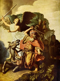 weer ok nix Rechtes, Ravil to trösten. Bileam kunn nich wedderstahn. Hei makte sienen Esel trecht un tröök loos. Denn avers stünn den Esel so en hell-strahlen Wesen in'n Weg, hei bleev as en muurt Pieler stahn. Bileam prügelte sienen Esel, de ja dösig is, as de Lüüd seggen. As dat mit dat mit de Prügelie nich uphörn wull, geev Gott den Esel een minschlich Stimm. "Wat sleist du mi so aasig? Sühst du den Engel nich? Willst Du wiedergahn un de Hebräer flöken?" Dor keem Bileam to Vernunft. De "dösige" Esel harr allens in Ornung bröcht.