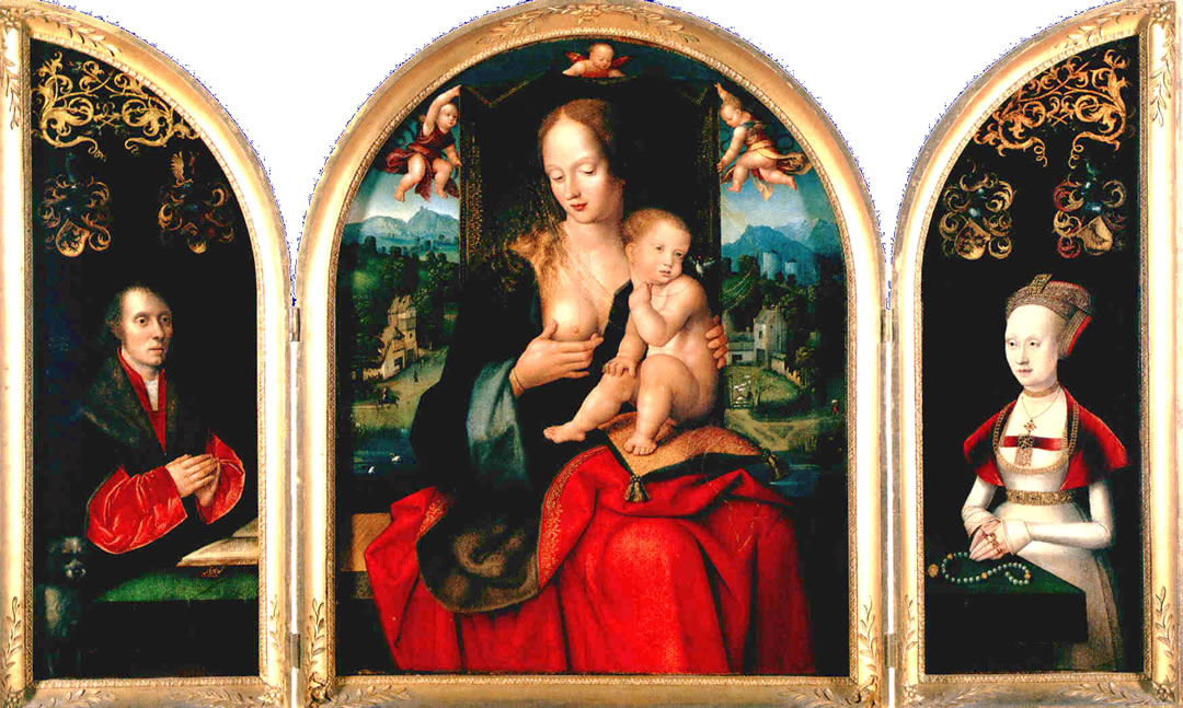 | Beid seht se nich so recht froh ut. Villicht hebbt se Sorgen. Dat weer en swierig Tiet, as de Altar 1520 maalt worrn is. Herr Kerckring weer Raatsherr. Dat Geld weer knapp in de Stadt Lübeck. Korte Tiet later wörr Lübeck evangelisch. Dat weer de Tiet vun Jürgen Wullenwever. Dor weer veel Unroh in de Stadt, mag sien, dat Kerckrings sik dor Sorgen üm maakt. Un dorüm kiekt se villicht beid up dat Bild in de Mitt, vull Höpen un Tovertruun. | ||||