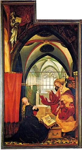Dat schient, as wenn Maria trüchwieken deit vör den himmelischen Storm, de up se dalkümmt. Se hett sik verfehrt, liggt en beten up ehr folden Hannen un böögt sik na achtern. Ehre Oogen sünd slaten, villicht noch vun dat Beden, vun dat Versenken, un een kann annehmen, dat se den Engel gor nich süht, aver sien Botschap as en binnersietig Vision beleven deit.