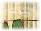 Wi seht achterlich enen grönen Vörhang un vörn links enen roden. En Vörhang, de sall wat afdecken. Hier grenzt he den persönlichen Ruum vun ene junge Fru af. Se hett sik to'n Lesen un to'n Beden trüchtrocken. As de Engel to ehr keem un Gott sien Botschap bröch, dor is dat nich mehr alleen ehr Saak, dat geiht nu de ganze Welt wat an, un dorüm sünd de Vorhänge an de Siet trocken.