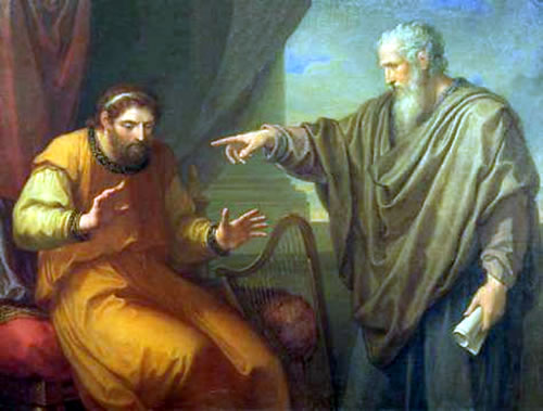 Bathseba legg sik Truerkledaasch an, un as de Tied rüm weer, lett David se in sin Huus haalen. Se ward sin Fruu un schenk em en Söhn. David wär vun Meenen, dat keeneen dat mitkreegen harr, dat he in Ehbruch, Mord un Leugen afrutscht is. He meent, he hett dat so plietsch angahn, dat he sin Gesicht dorbi wahrt hett. He is doch de König und hett dat Seggen. Aver denn kummt em de Prophet Nathan in de Mööt. Nich as Moral-Apostel, nich as Anklaager, nich mit den utreckt Wiesfinger. Nee, he vertellt em en Geschicht: 2. Samuel 12, 1-7, so översett vun Karl Emil Schade: