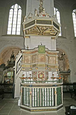 Üm de Kanzel rüm hebbt se en Schrankwark en Gitter maken laten mit veel Inschriften ut de Bibel. Baben rüm hebbt se en Flechtwark ut veel verdreihte Stränge smeden laten, de so verknütt un verslungen sünd, dat een dor keen Anfang un keen Enn finnen kann. Dorto gifft dat ene Sage, heel un deel mittel-öllersch symbolisch: