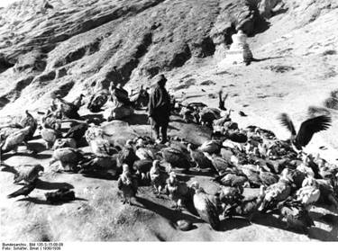 De Tibeter leven in de hoge Bargen vun'n Himalaya, allens is Stein. De Winter sünd lang un koolt. Starvt een, denn ward he in en Prozeschoon to'n Gräffnisplatz bröcht. Dor töövt de Hevensbestatter un de Geier. De Liek ward in lütte Stücke sneden, de Geiers haalt sik ehr Deil und fleigt in de Welt.