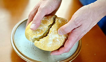 Un in de Mitt vun't Bild, op en Disch: Brot un Wien, Abendmahl.