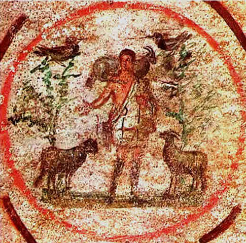 De steiht in Caesarea in Israel, un dortau höört de Text vun't verlorn Schaap. De Schäper steiht as Bild vun Gott. De Schaap staht för alle Minschen. Dat Schaap, dat sik verbiesterte, is en Bispill för all de Minschen, de vun ehr Weeg afkamen sünd. De hebbt Schuld up sik laden. De sünd biester gahn. Un faken weiten se nich, woans se trüüch finnen daut. Gah mi doch loos, dat is so en Glieknis von Jesus un so. Dat hannelt