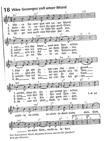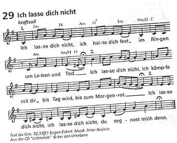 de De Segen warrt wiedergeven an de nafolgen Karkendaag: den neegsten Katholikendag in Ulm, den neegsten evangeelschen Karkendag in Hannover. Wedder separat man nich mehr trennt. 2008 schall denn wedder tosamen fiert warrn. Mi dücht, so köönt alle Konfeschoonen tosamen bestahn: een Sinns in't Loff vun Gott ok mit ehr Ünnerscheden. Mehr Ökumene brukt dat eentlich gor nich, geiht mi dör'n Kopp Veelfalt is ok ganz schöön, wenn se so fierlich un freedvull is. De Glaubwürdigkeit nimmt dorbi keen Schaden mehr. Dorbi nich. Marlou Lessing
