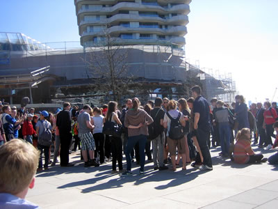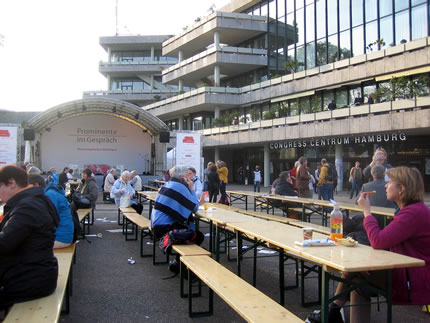 Anja kümmt, un wi seilt so ganz sinnig in Richtung Hafencity. Mit uns tosommen geföhlte dusend anner Minschen. Mi kümmt de Parkplatz wedder in Sinn. Veele Bauden, Stände, Dische, Bänke för den "Obend, sik to bemööten". Anja kennt sik ut. Wieder in Richt op de groode Bühn to. Mit uns noch mehr Minschen,
