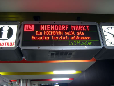 1. Dag: Middeweeken Nomiddag Klock 2: Wi föhrt tohuus los. S-Bohn Parkplatz Nettelnburg. Oh kiek, wo kümmt de denn her? De Autonummer kenn ik hier gor nich De ook nich Un de??????? Och kiek, de het ook en Fisch-Opbacker an sien Auto. Oh, dat is en Posaunist Woso parkt de denn alle hier, givt doch so veele Parkplätze rings üm Hamborg????? Rupp op den Bohnhof. Kiek, de Mann dor, de het all en Karkendagsschal. Un dor, de ganze Familie. De S-Bohn kümmt. Noch mehr Lüüd mit Rucksäcke un blaue Schals. Hauptbohnhof rut. Minschen mit Rucksäcke, Kuffer, blaue Schals,