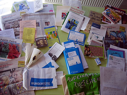 geit dat ook schon wedder rut ut de Kark. Vördrach över en Kunstistallation. Nee, wi mööden nu ers no'n Supermarkt, Obendbrod inkööpen. Picknick op de Wisch vör dat Gemeendehuus. Obendgebbed op Platt. 5. Vadderunser.