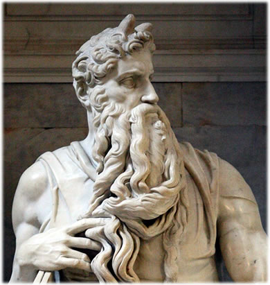 As man hüt weit, würn dei Geschichten üm Moses in't 5. Johrhunnert v. Chr. in fief Bäuker upschräben, dei up Hebräisch dei Thora, up Latinsch dat Pentateuchus un up Düütsch äben dat Pentateuch, dat "Fief-Rullen-Bauk" orrer dei fief Bäuker Moses heiten un den iersten Deil inne Bibel von Juden, den Tanach, un ok inne Bibel von Christen, dei Hillig Schrift, utmåken. So is Moses dei Prophet bi Christen un Juden un sülfst bi Muselmanen is hei einer vonne Propheten in'n Koran. Moses sall lücht un stråhlt hemm', as mit dei Gesetzestafeln von'n Barch Sinai tau sein Lüd rünnerkeem äbenso as dei Ring inne Ringparabel ut "Nathan dei Klauke", in wecker Lessing vertellt, dat 'n Vadder taun echten Ring noch twei glieke anner måken lött, dormit keinein von sien drei Shns mitkriegen sall, wecker Ring dei würklich echte un dat kein Globen bäder as dei anner is. So is dat ok mit Moses. All drei groten Religionen hollen em för ehrn Propheten, doch as dei Christen in't 8. Johrhunnert anfüngen, ut denn hebräischen Text dei "Vulgata", dei latiensche Bibel tau måken, dunn is dat mit dei Hüürn passiert. Dat hebräisch Wurt "Kehren" för Stråhlen hemm' dei Schriftgelihrten as "Cornu" för "Huurn" hollen un so kreech Mose nich den Hilligenschien, sonnern Hüürn upsett't.