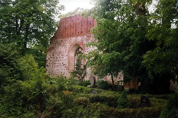 överschrifft sienen Bericht: "Hulen an frömde Wader". Un denn pultert dat een Nacht. Geiht de Krieg wedder loos? Ne, dat weern bloots de gootschen Gewölv un de Dackstauhl vun de ut dat 15. Johrhunnert stammende Kark. Dor wöör nu nich afsparrt: "Einsturzgefahr! Eltern haften für ihre Kinder!" Ne, elkeen kunn in de Ruin rümmerstockern. Denn wöörn de sworen Eikenbänk jümmer weniger. De sworen Dören verswünnen ok. Ut dat Pastoraat qualmten de Brennhexen, de harrn as Schosteen en Åvenruhr, dat dörch en rutnahmen Finsterschiev na buten güng.