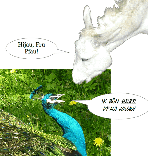 Endlich hebbt wi dat Deert ok mal sehn! Dat weer ja en ganz smucken Vagel, en Pfau!