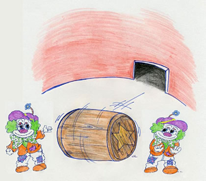 an. Een Menoasch, de steit bi so fiin Tomoal gung dat Lucht ut in dat Telt wee dat up eens so still man kunn woll een Noadel fall'n hörn. Wenn dor denn een an d' neien seet sää Opa. Psscht... keem dor glieks van achtern. De Vöörhang geit oapen gaanz sinnich rullt een grode Trummel bit in d' Mirden. Blossich de Trummel niks dorbi nümms de schufft un nümms de trüllert. Steit still rullt een bäten retour nochmoal noa vörn un ut! As so een Dönnerschlach faalt de Musik in un up beid Kanten dör dat Trummelfell springt een August.
