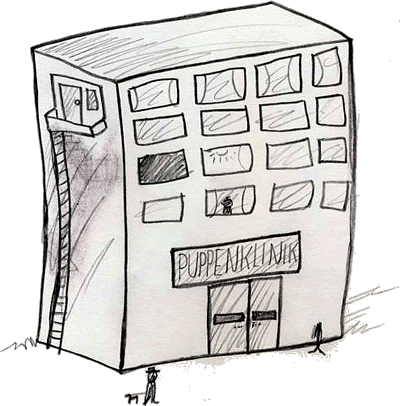 de Doalers dorföör hevv ik hier!" De beiden rin in Papas Auto. An een Huus mit de groode Upschrift Puppenklinik moakt Voader Stopp.