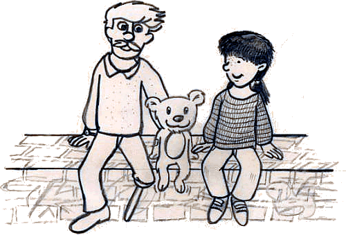See kunn man jüüst "Mama" särgen, dor leech he all bi hör in d' Bäed. Bevöör see up de Welt wee, har he all füfftich Joahr bi Oma Plüsch woahnt. Oma Plüsch, dat wee de Mama van hör Mama.