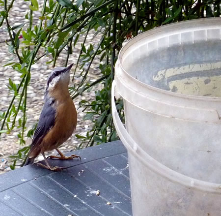 Den Deckel mit den groten Steen heff ik eenfach up de Siet schaven. Dat weer för mi gor nich so licht un denn heff ik mi richtig satt freten! Achterna kemen ok noch de lütten Vagels un hebbt sik bedeent! De Kleiber reck sien Kopp, truu sik aver noch nich so recht.