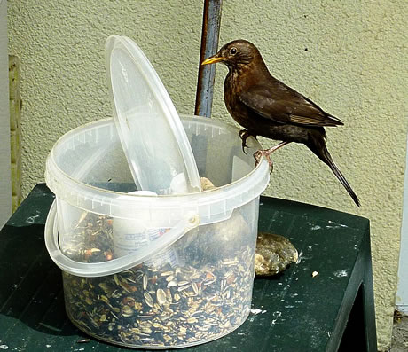 De Amselfru sett sik glieks up den Ammerrand. Dor kunn se beter kieken un in den Ammer langen!
